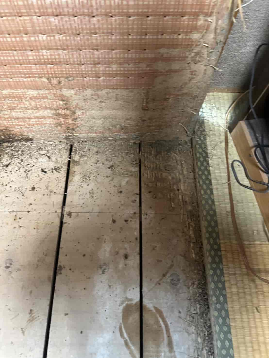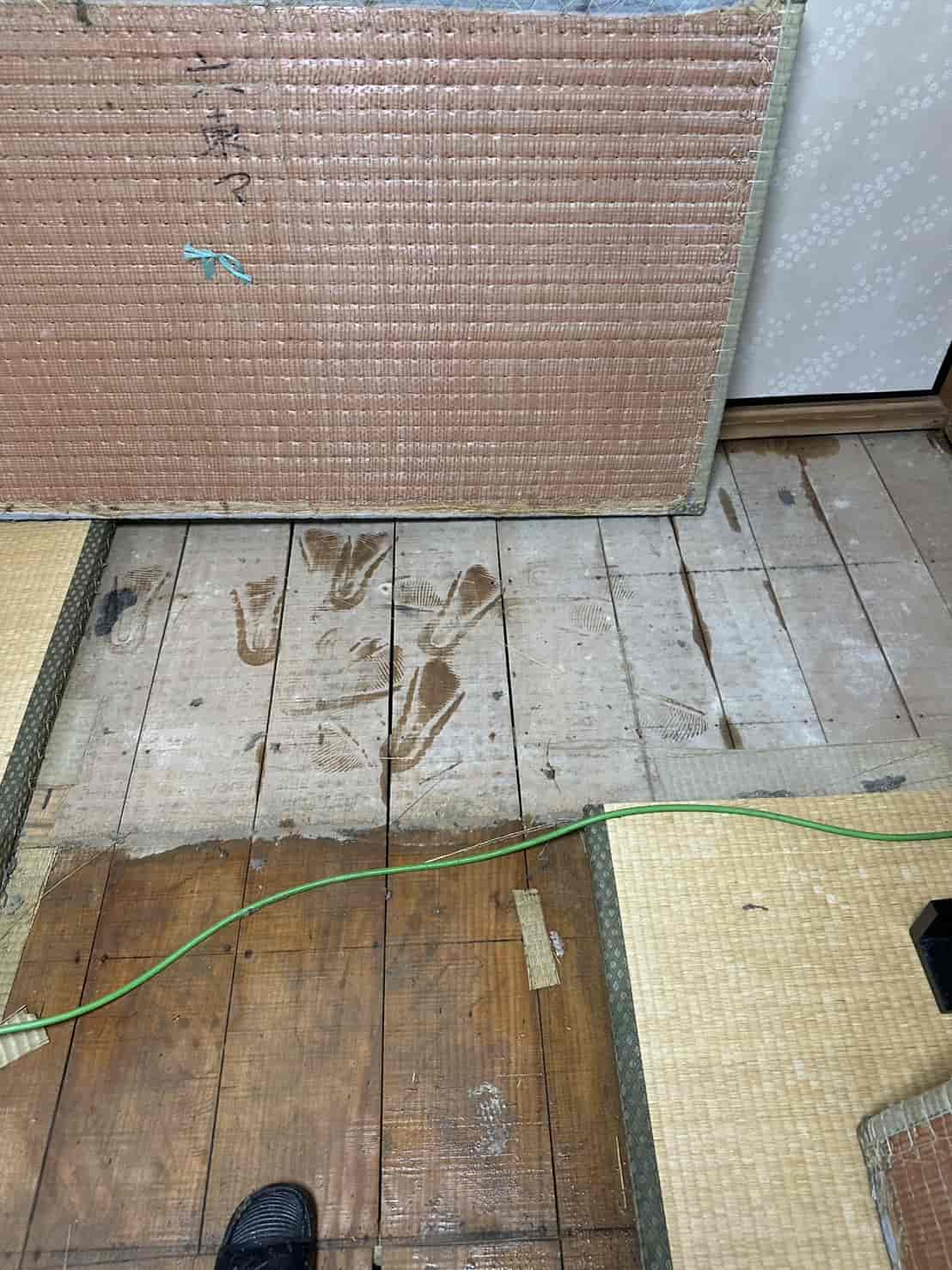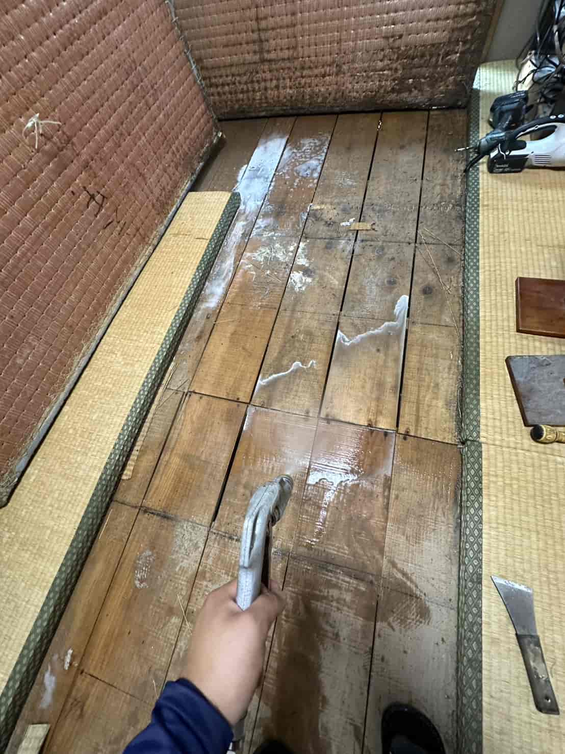 被害のあった2階和室では、畳を一時的に上げ、座板部分の被害箇所を切除。