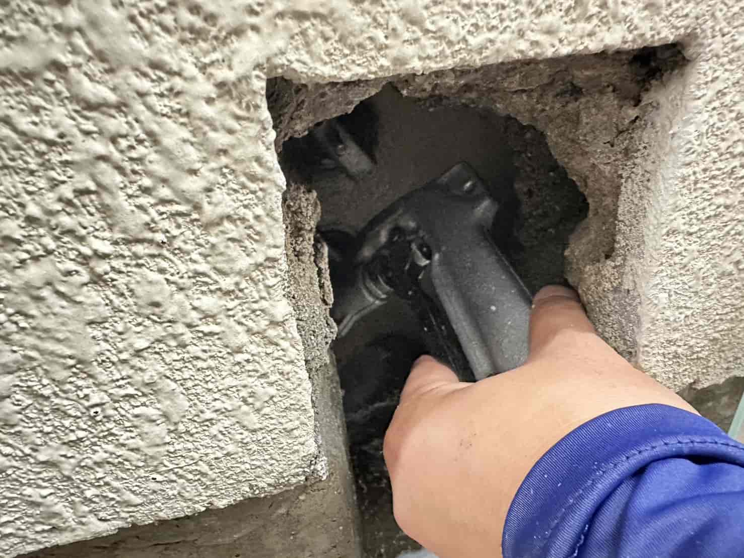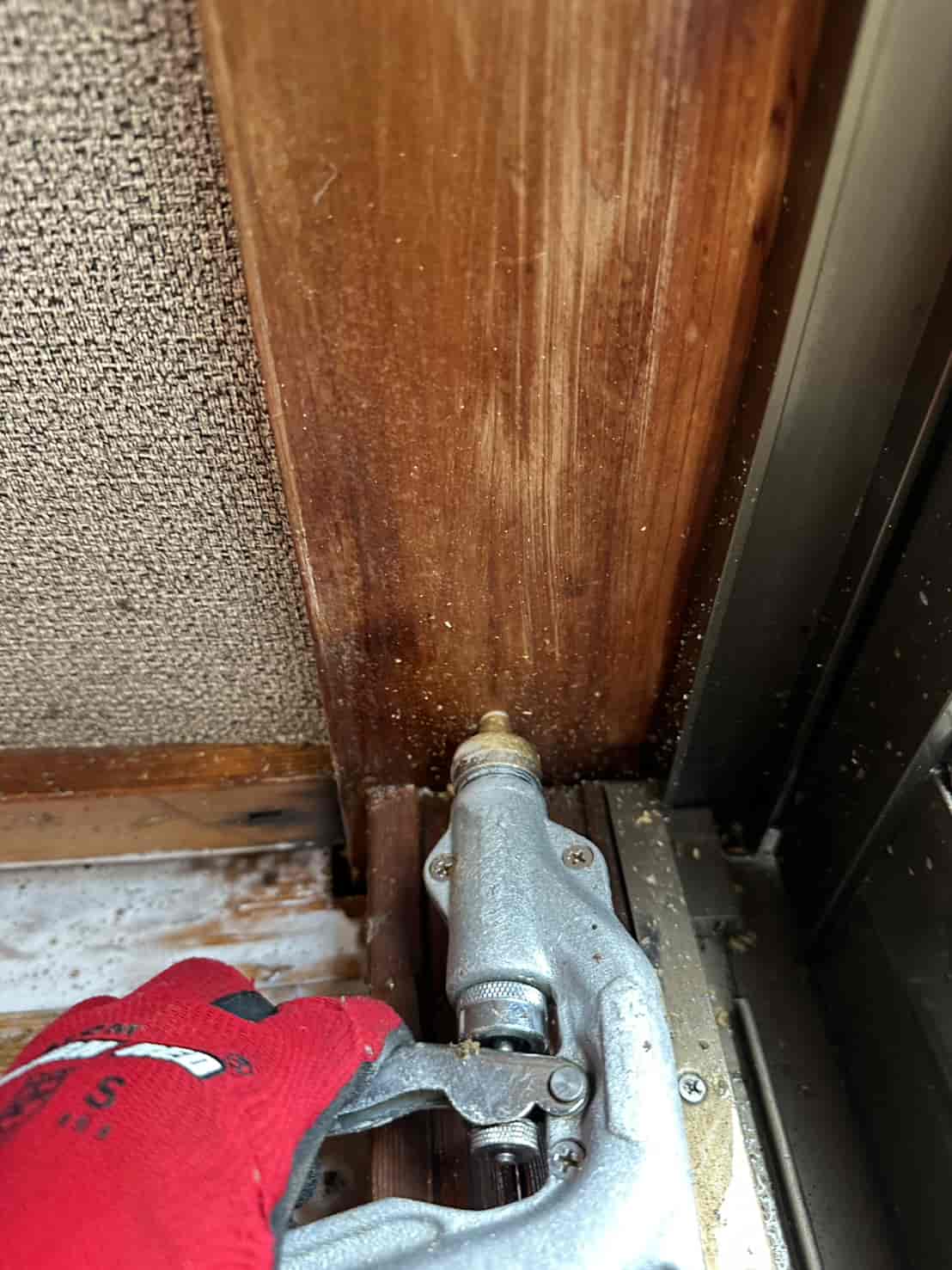 一見すると表面は大きな異常が見られない箇所もありましたが、木槌で軽く叩くと内部がスカスカになっており、イエシロアリによる内部食害が進んでいる状態でした。