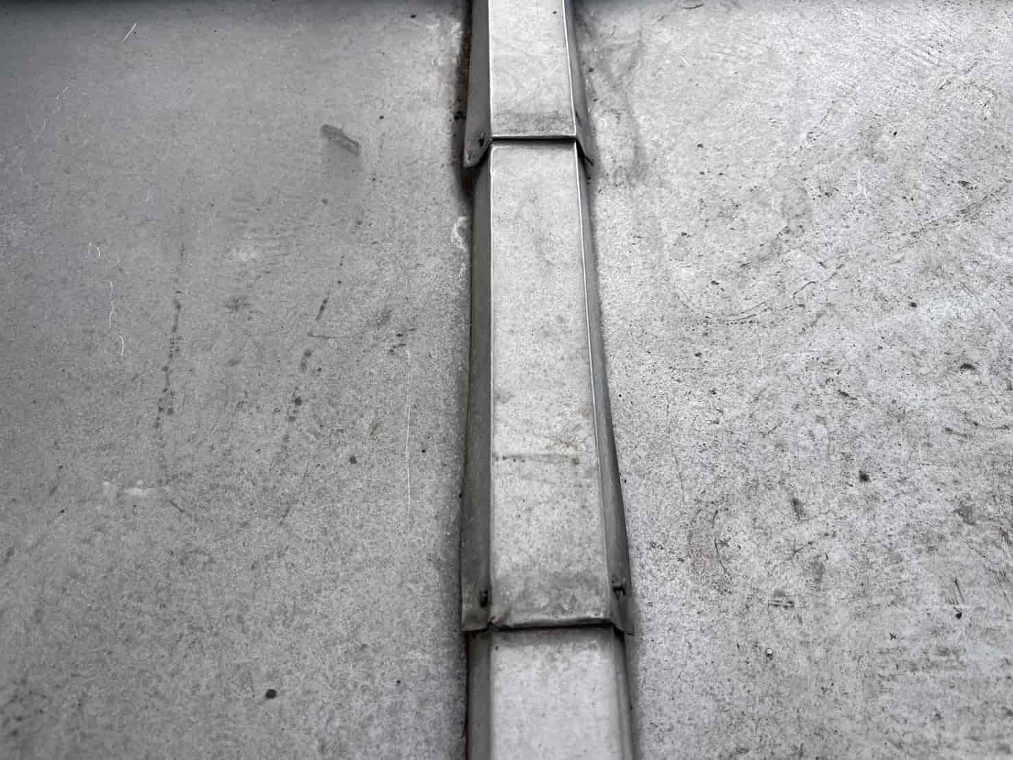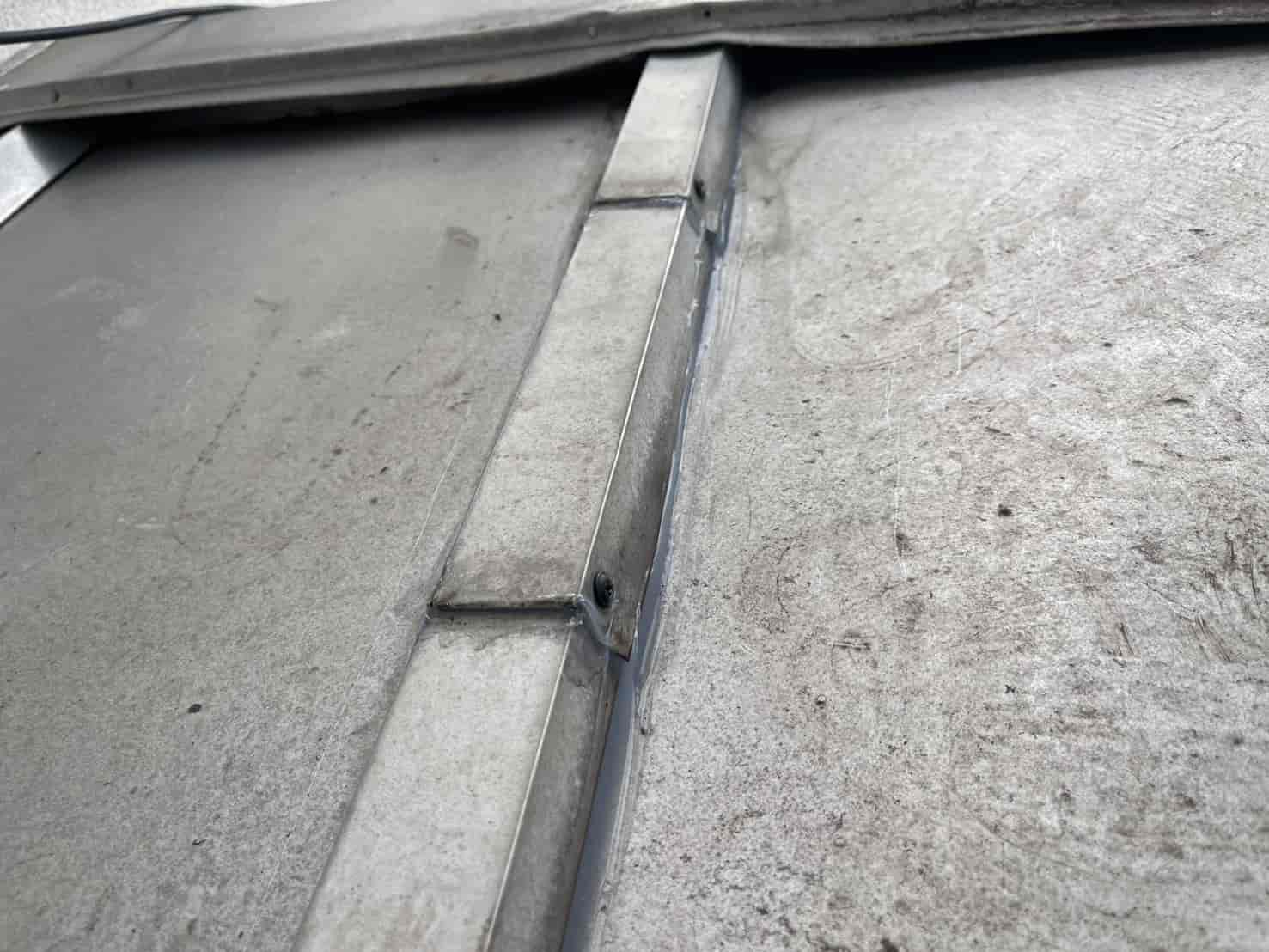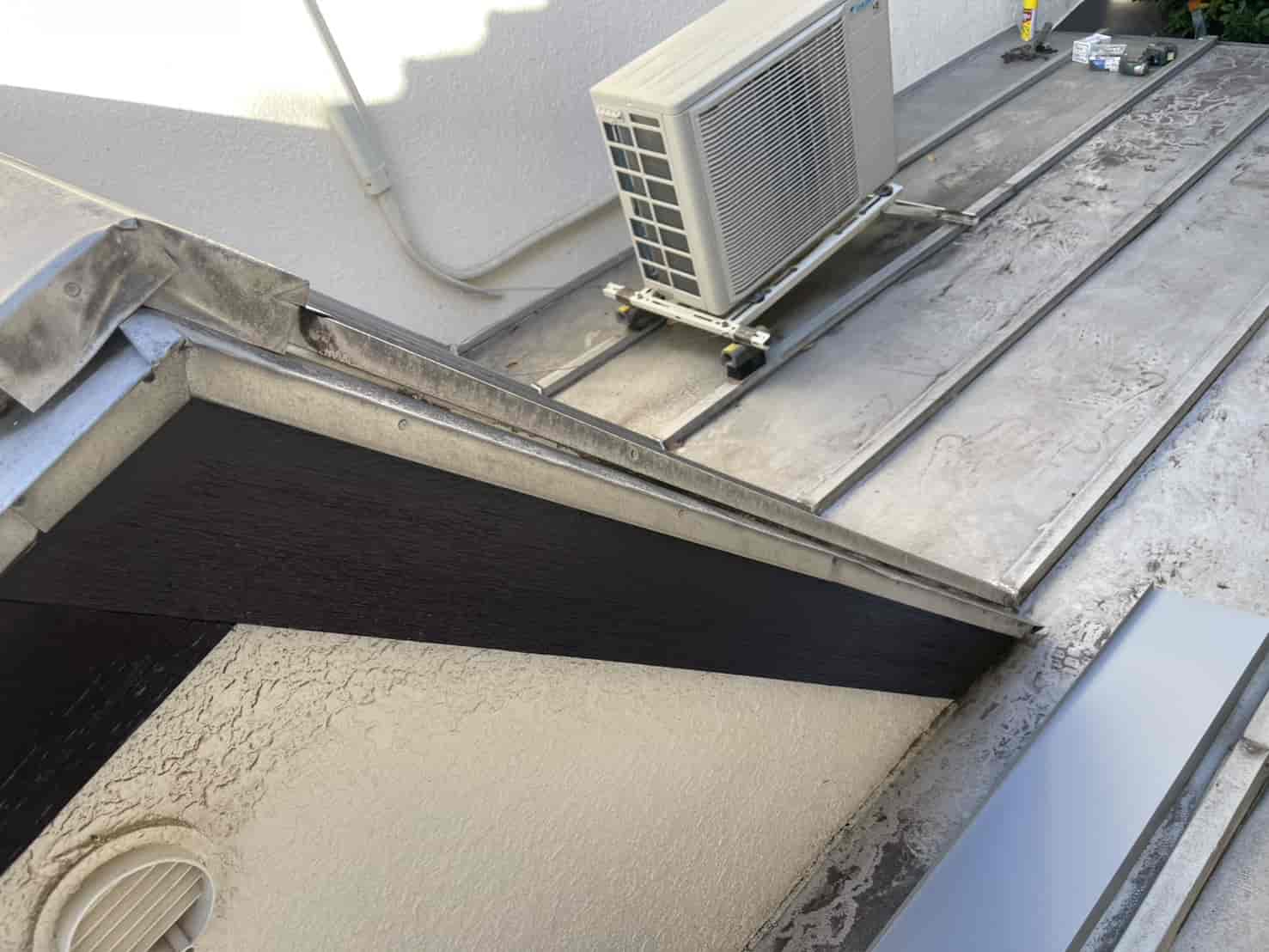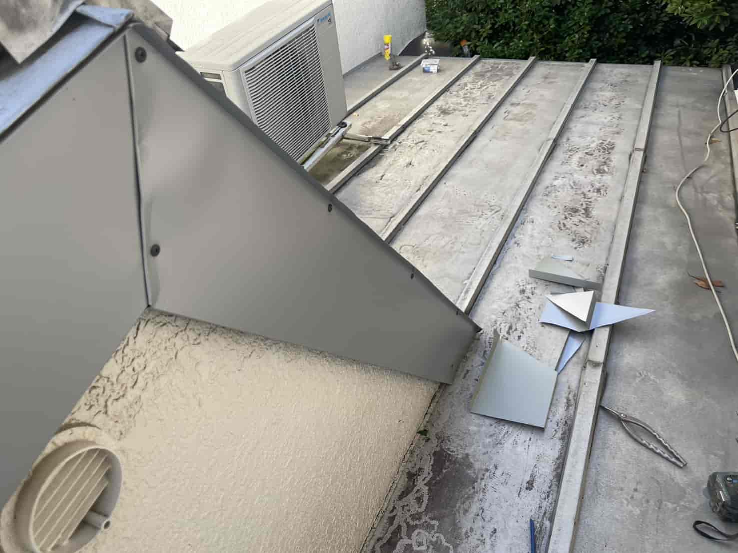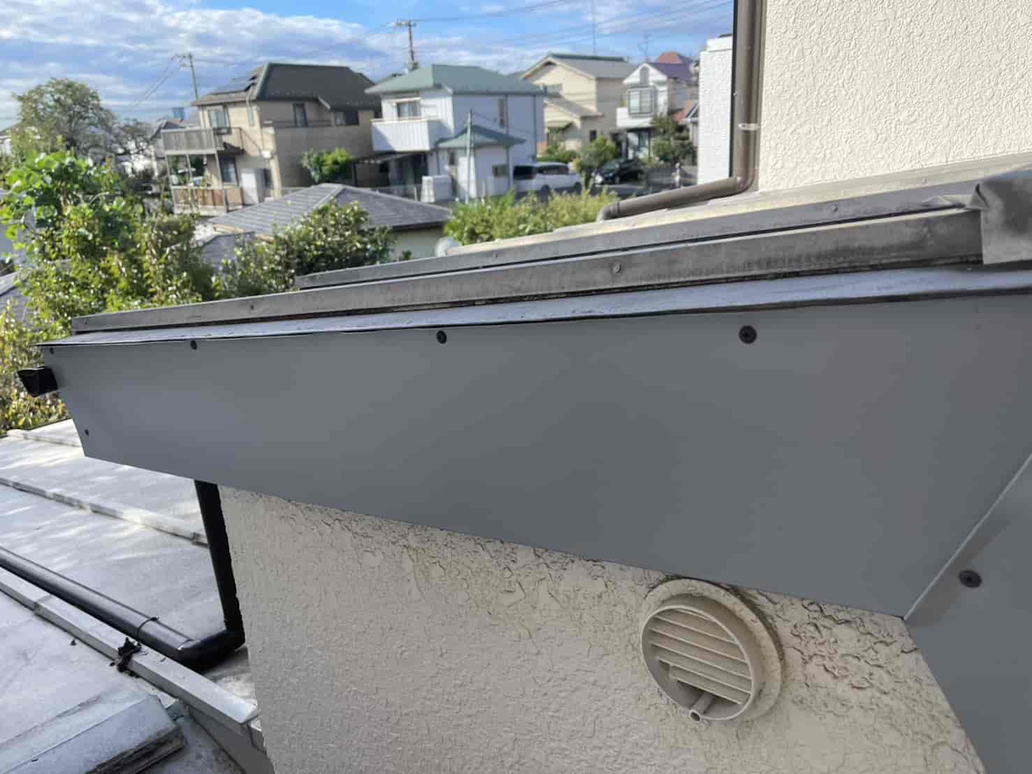 さらに、風雨による吹き込みが多かったハフ(軒先)部分には、板金加工物を新たに取り付けました。これは、既存の屋根形状に合わせて現場で板金を成形し、雨水が入り込む隙間を覆うように設計したものです。板金職人による手作業での加工により、既存の屋根ラインに自然に馴染み、美観を損なうことなく防水性能を向上させることができました。固定部にはパッキン付きビスを使用し、熱膨張による浮き上がりも防止しています。