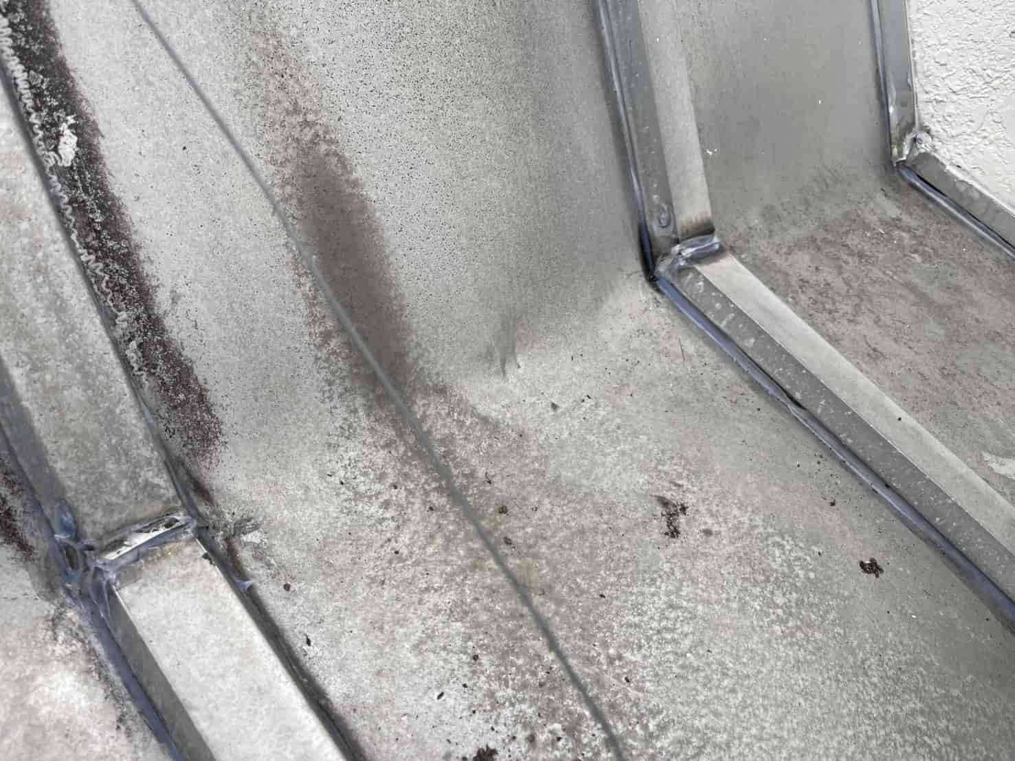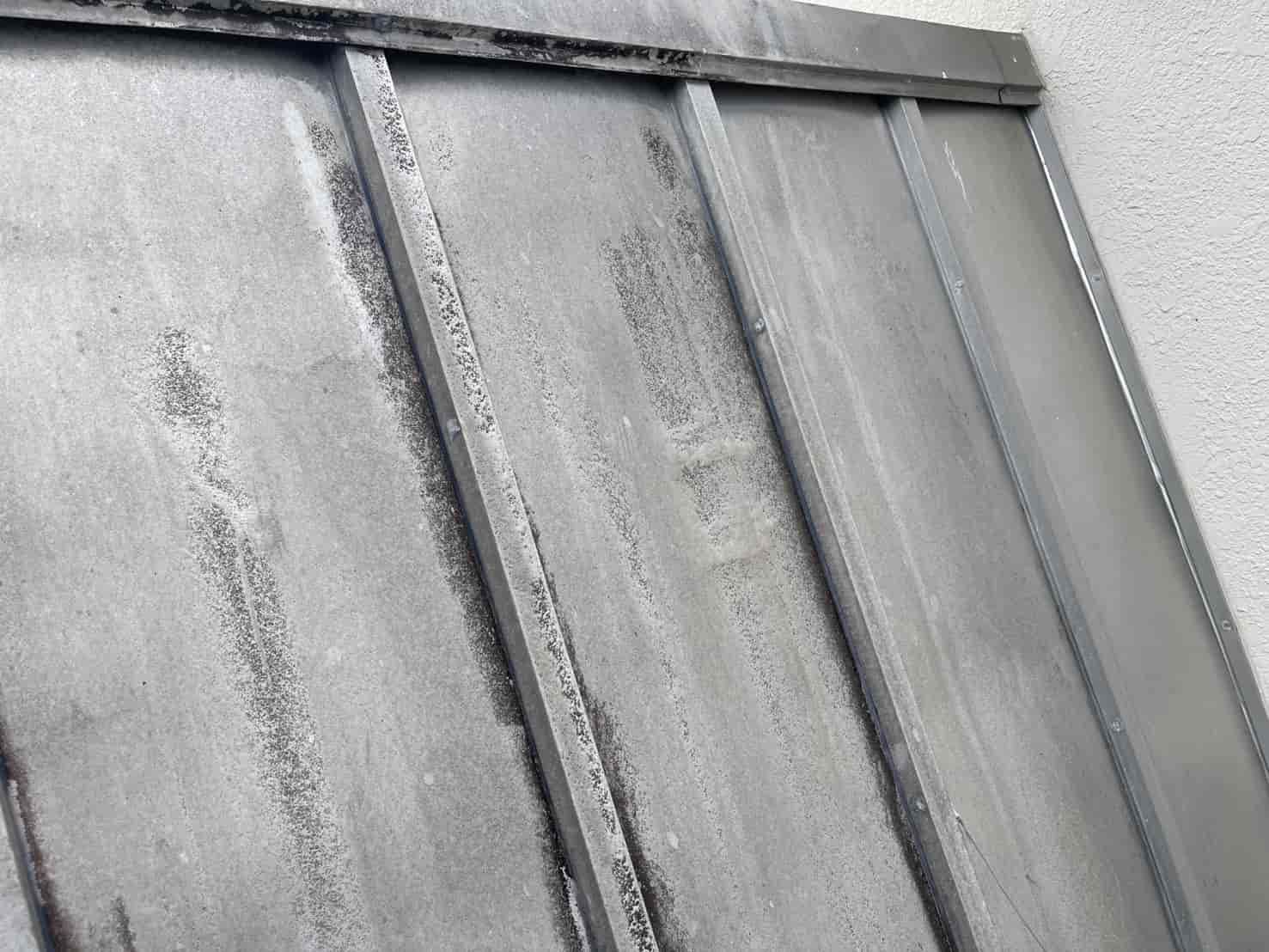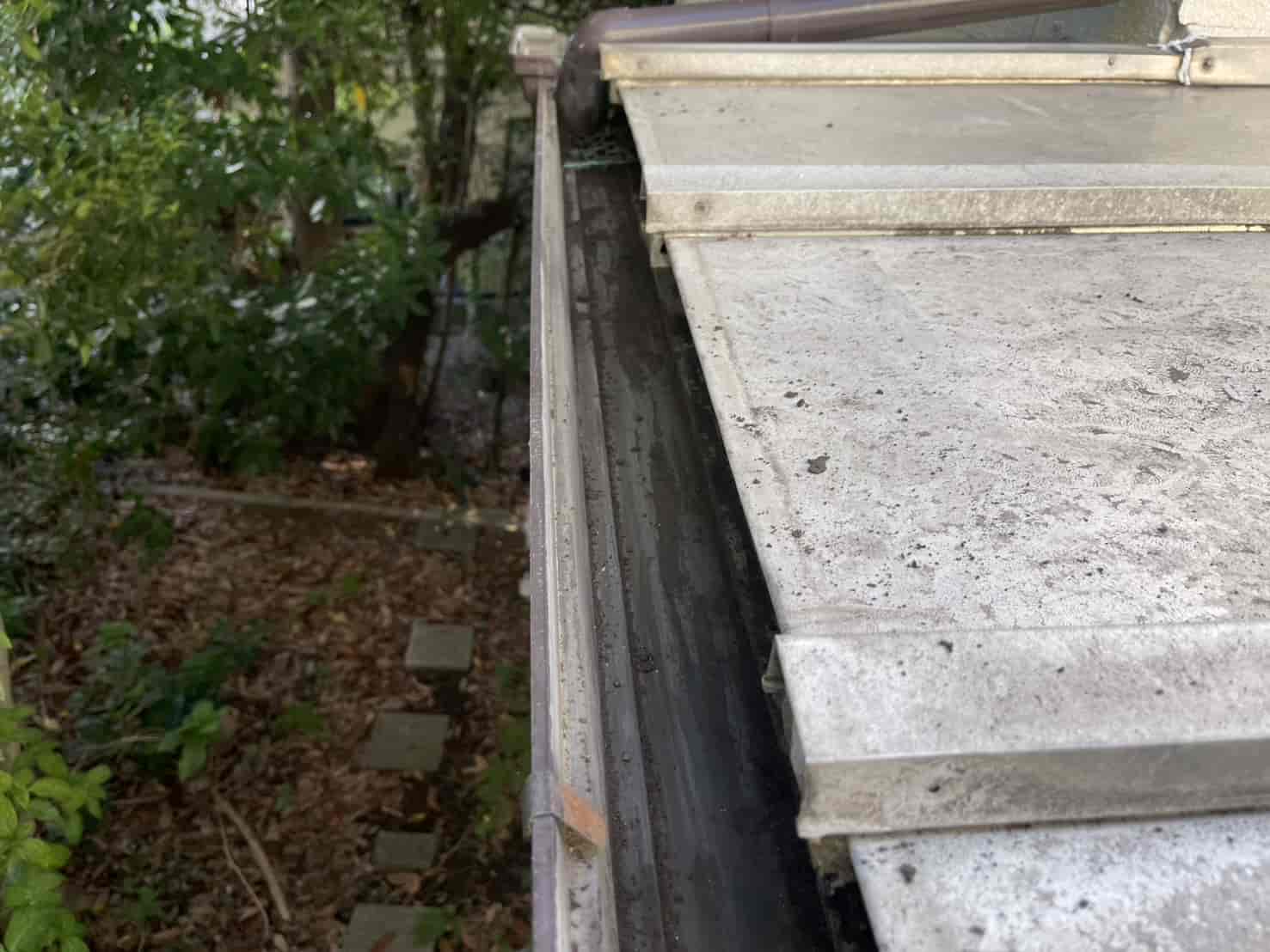 まず、屋根の瓦棒部分を確認すると、金属屋根の継ぎ目である接合部のシーリングが劣化し、釘の緩みや一部抜けも見られました。これにより、雨水が毛細管現象によって内部へ吸い上げられ、下地の木部に染み込んでいる状態でした。放置すれば木材の腐食や断熱材の劣化につながるため、早急な補修が必要と判断しました。