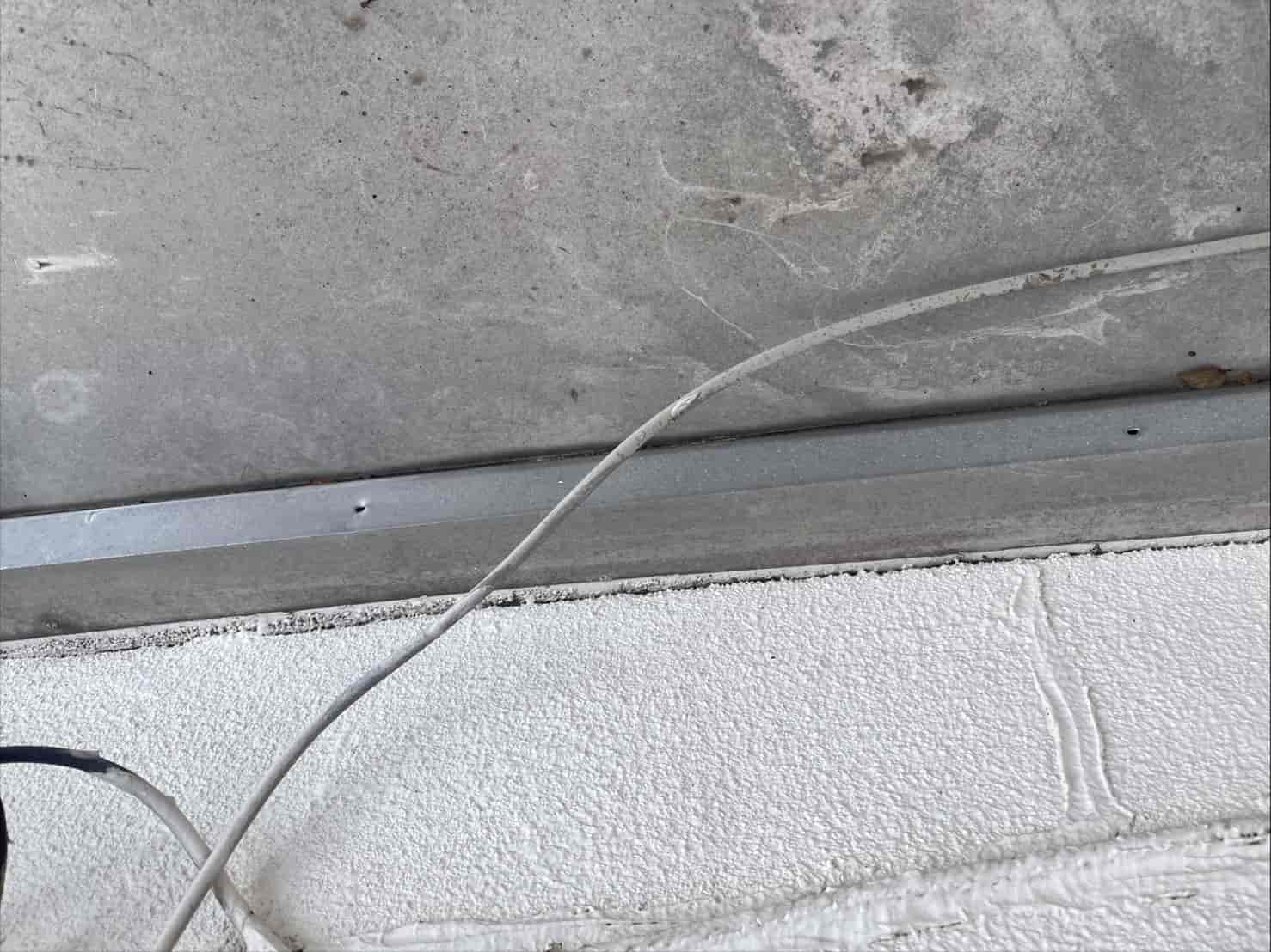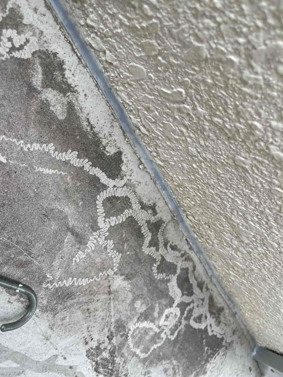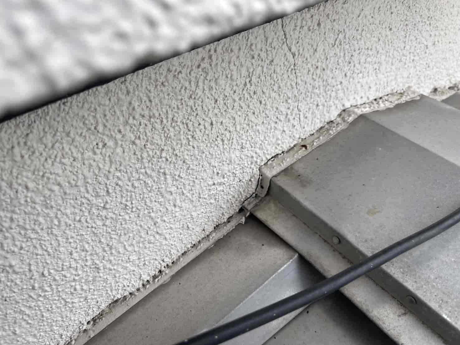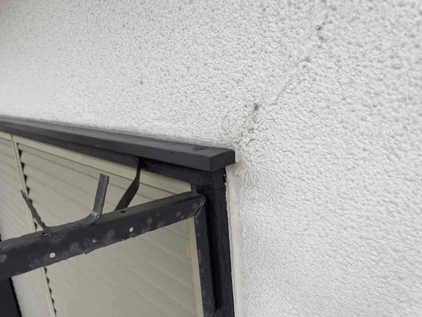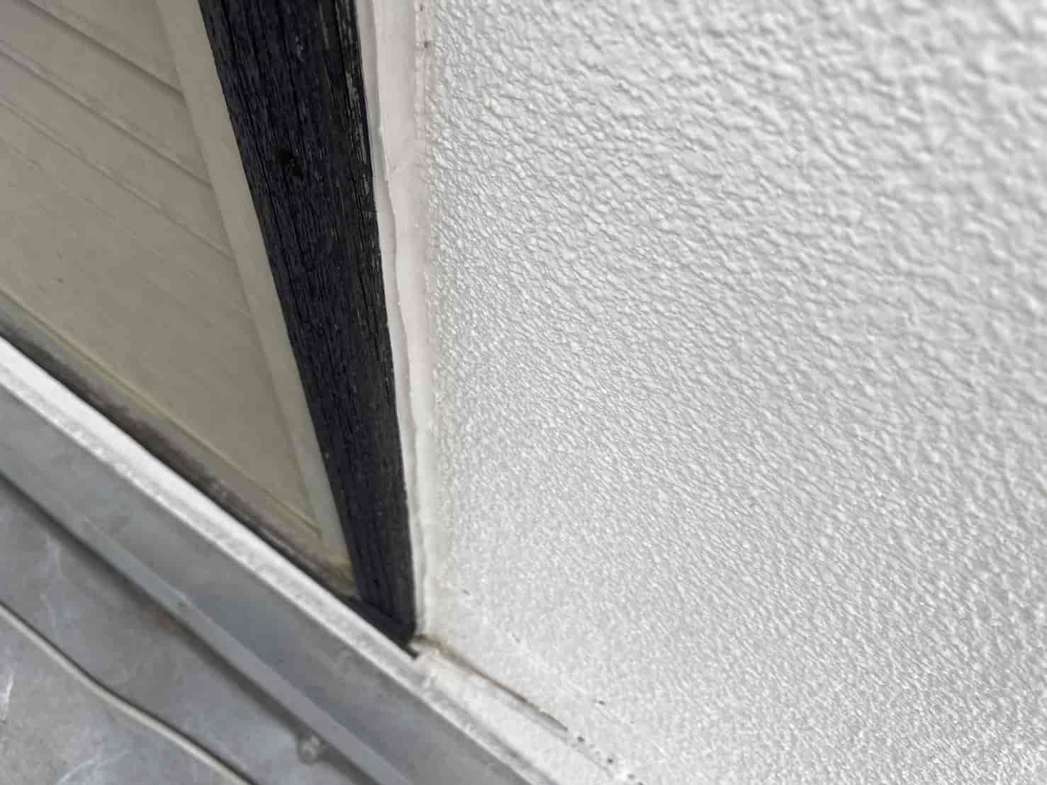 次に、窓枠まわりを点検すると、サッシと外壁の取り合い部に隙間があり、シーリングのひび割れも発生していました。ここから吹き込んだ雨水が、内側の壁を伝って室内へ到達していたと考えられます。また、軒天(ハフ)部分からも雨水が逆流し、屋根裏にまで湿気がこもる状態でした。